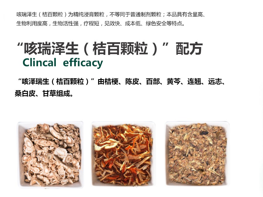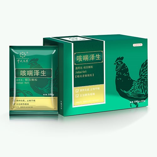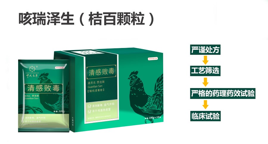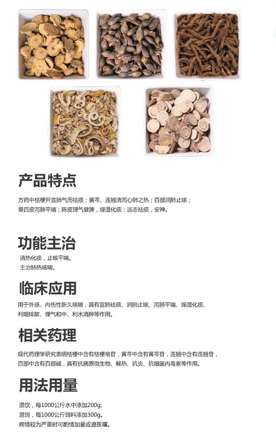 【處方】桔梗、陳皮、百部、黃芩、連翹、遠志、桑白皮、甘草。 【性狀】本品為棕黃色至棕褐色的顆粒。 【功能】清熱化痰,止咳平喘。 【主治】肺熱咳喘。 【用法與用量】 混飲,每1000公斤水中添加200g; 混飼,每1000公斤飼料添加300g。 病情較為嚴重時可酌情加量或遵醫(yī)囑。