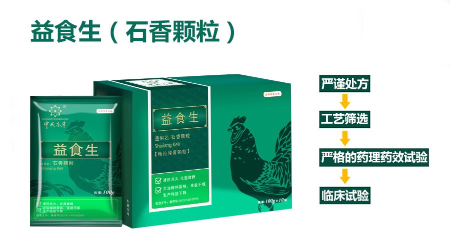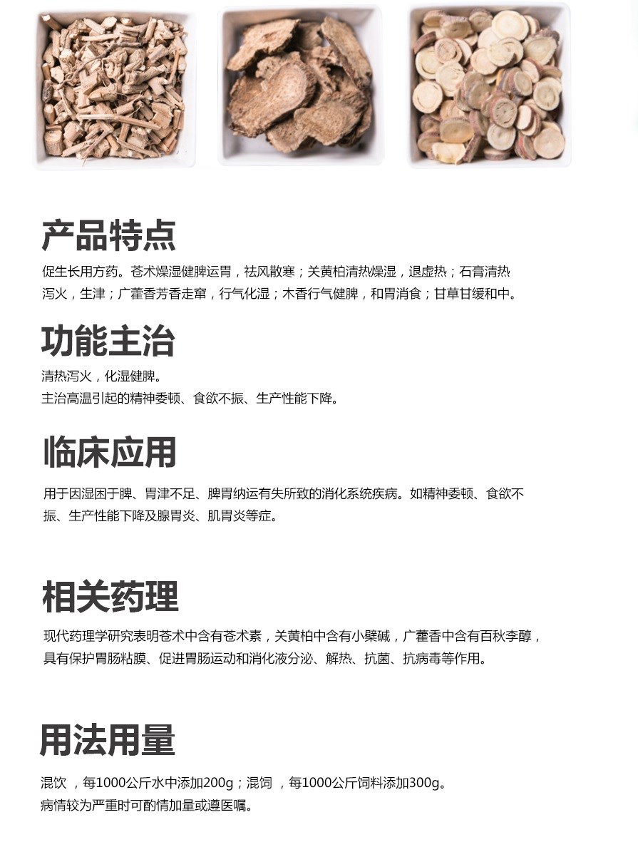 清熱瀉火,化濕健脾。 主治高溫引起的精神委頓、 食欲不振、生產性能下降。