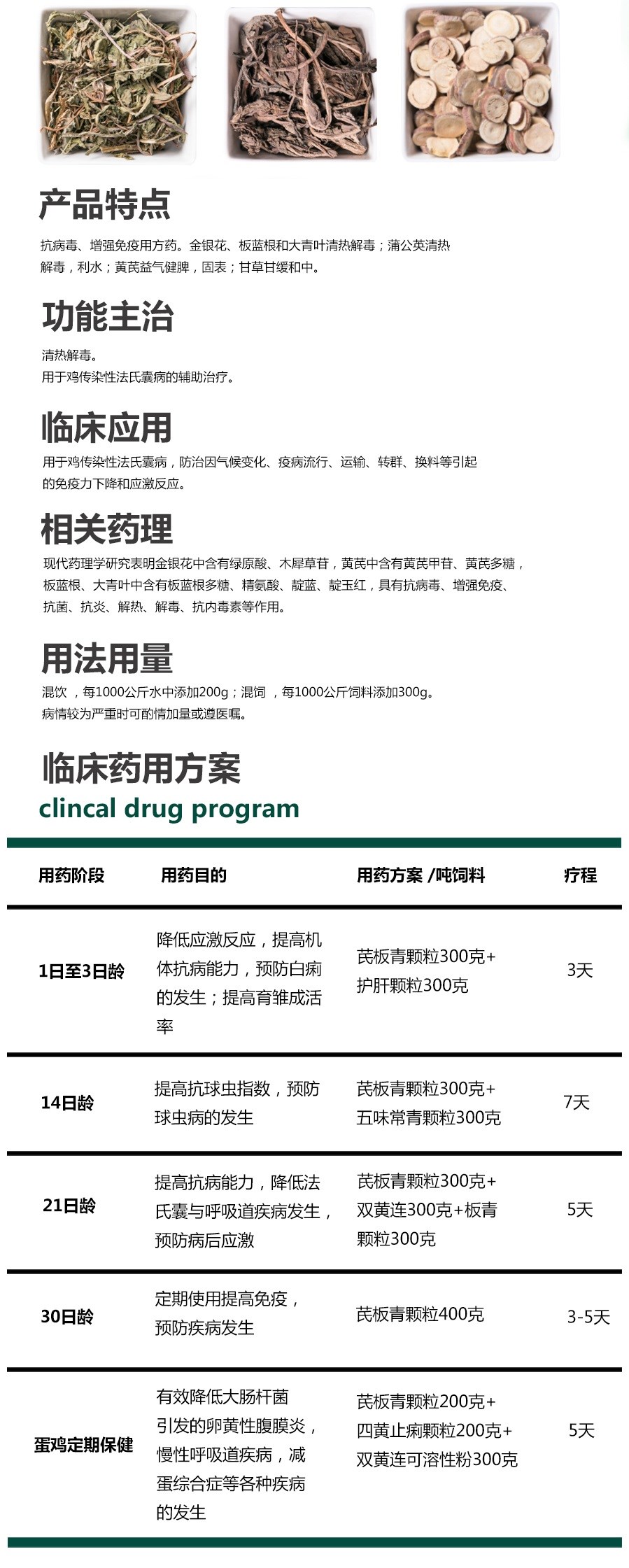 清熱解毒。 用于雞傳染性法氏囊病的輔助治療。