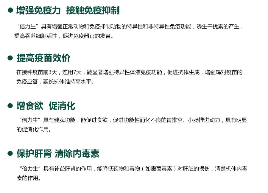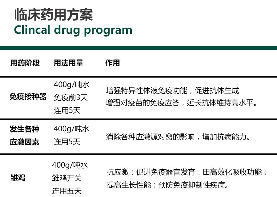 用于應(yīng)激綜合征、免疫力低下及免疫抑制性疾病、 配合疫苗使用,增強(qiáng)疫苗免疫效果。