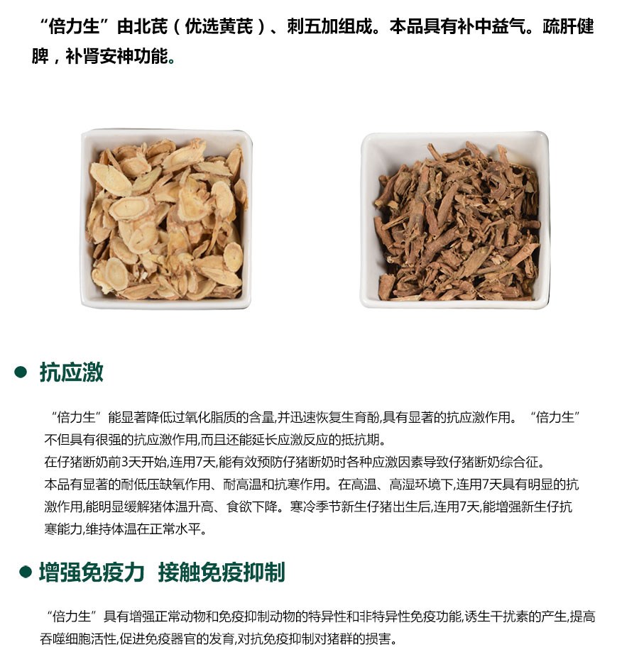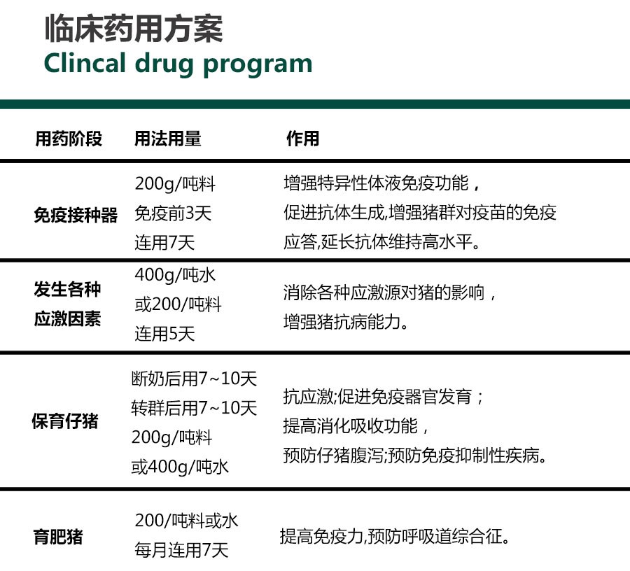 用于應(yīng)激綜合征、免疫力低下及免疫抑制性疾病。配合疫苗使用,增強疫苗免疫效果。