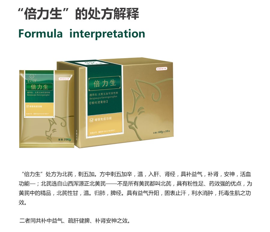 【處方】 黃芪、刺五加。 【性狀】本品為棕黃色至棕褐色粉末;味甜,微苦。 【功能】增強動物機體免疫功能。 【主治】免疫功能低下。