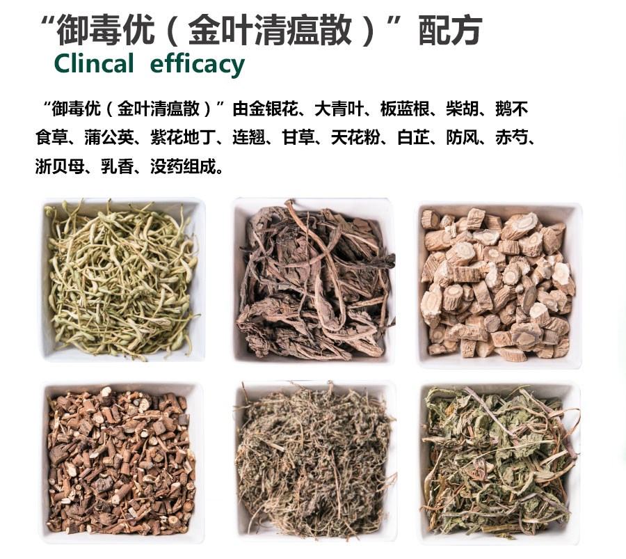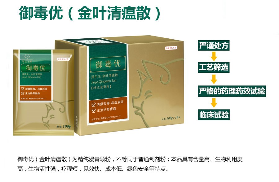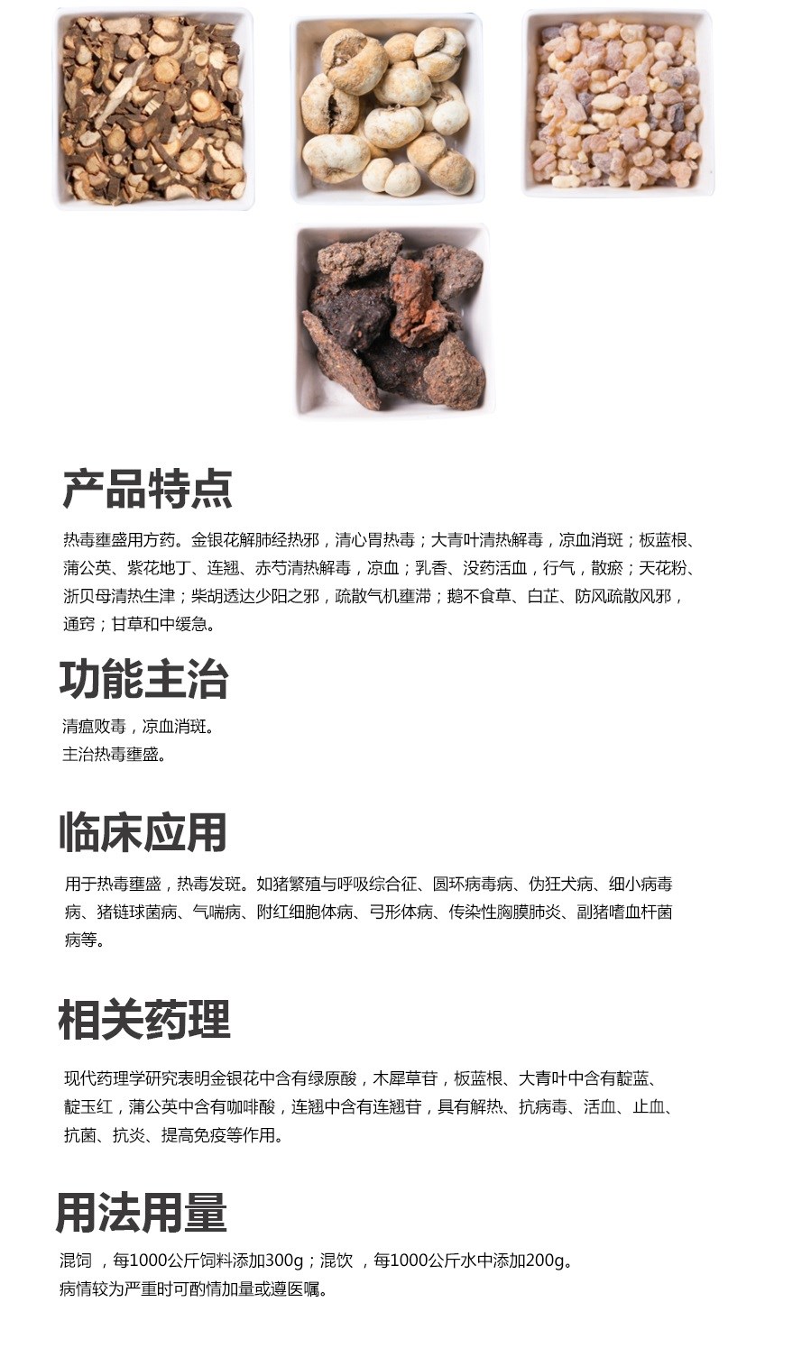 【處方】金銀花、大青葉、板藍根、柴胡、鵝不食草、 蒲公英、 紫花地丁、連翹、甘草、天花粉、白芷、防風、赤芍、浙貝母、乳香、沒藥。 【性狀】本品為灰褐色粉末;氣微香,味苦。 【功能】清瘟敗毒、涼血消斑。 【主治】熱毒壅盛。 【用法用量】 混飼,每1000公斤飼料添加300g。 病情較為嚴重時可酌情加量或遵醫(yī)囑。