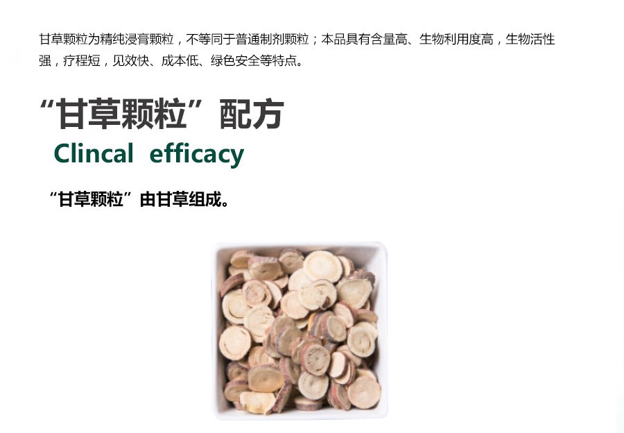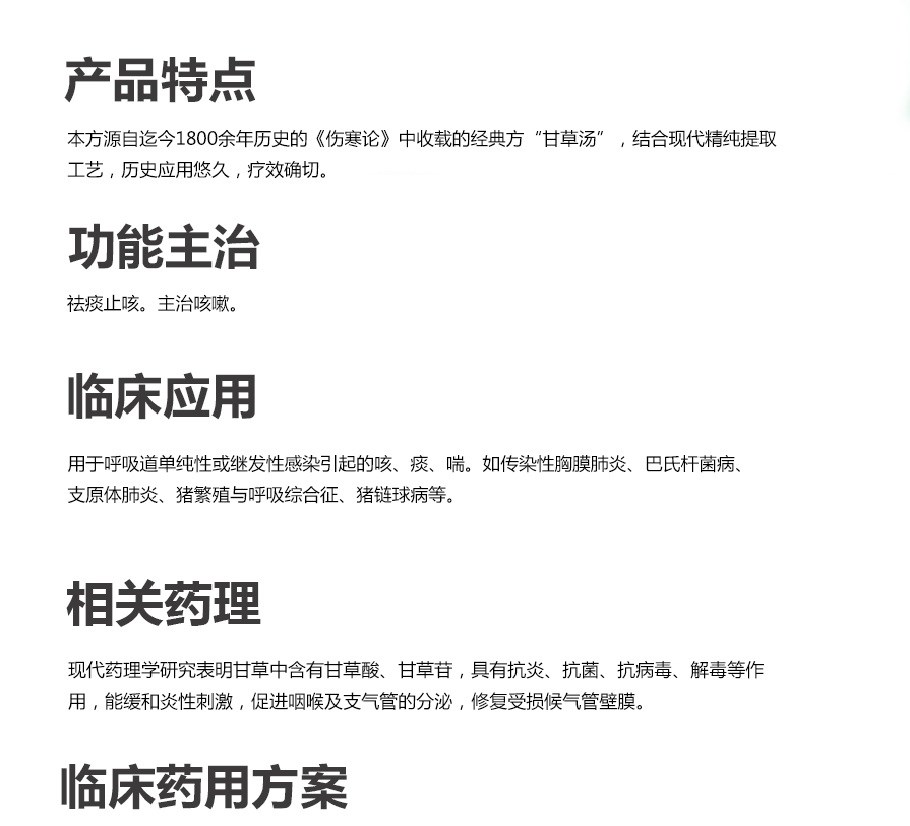 本方源自迄今1800余年歷史的 《傷寒論》中收載的經(jīng)典方“甘草湯”,結(jié)合現(xiàn)代精純提取工藝,歷 史應(yīng)用悠久,療效確切。