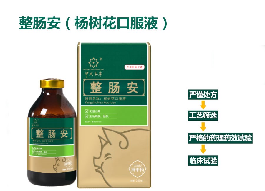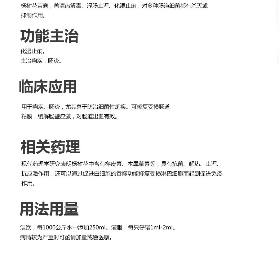 【處方】楊樹花。 【性狀】本品為紅棕色的澄明液體。 【功能】化濕止痢。 【主治】痢疾,腸炎。 【用法用量】 混飲,每1000公斤水中添加250ml。 灌服,每只仔豬1ml-2ml。 病情較為嚴(yán)重時可酌情加量或遵醫(yī)囑。