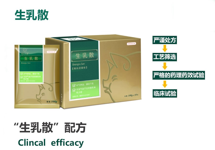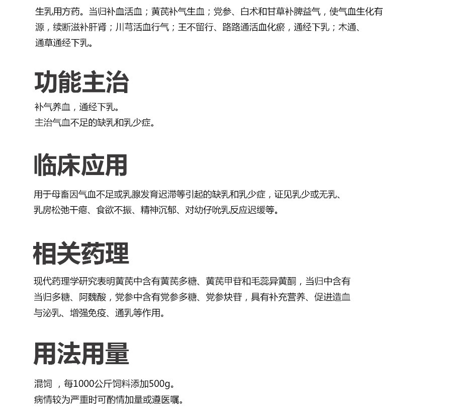 【處方】黃芪、黨參、當歸、通草、川芎。 【功能】補氣養(yǎng)血,通經(jīng)下乳。 【主治】氣血不足的缺乳和乳少癥。 【用法用量】 混飼,每1000公斤飼料添加500g。 病情較為嚴重時可酌情加量或遵醫(yī)囑。