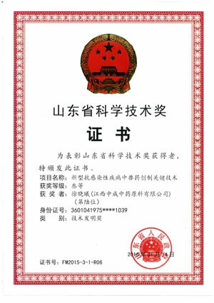 | 2016年6月,山東省2015年科學(xué)技術(shù)發(fā)明獎(jiǎng)結(jié)果揭曉,江西中成中藥原料有限公司參于研究的“新型抗感染疾病中獸藥創(chuàng)制關(guān)鍵技術(shù)”項(xiàng)目成果喜獲山東省科學(xué)技術(shù)發(fā)明三等獎(jiǎng)。