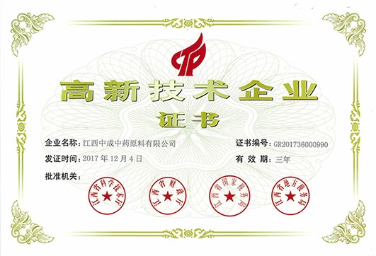 據(jù)最新修訂的《高新技術(shù)企業(yè)認定管理辦法》(國科發(fā)火〔2016〕32號)和《高新技術(shù)企業(yè)認定管理工作指引》(國科發(fā)火〔2016〕195號)文件規(guī)定,經(jīng)審定,江西中成中藥原料有限公司符合高新技術(shù)企業(yè)認定條件,被認定為“高新技術(shù)企業(yè)”(證書編號:GR201736000990)。